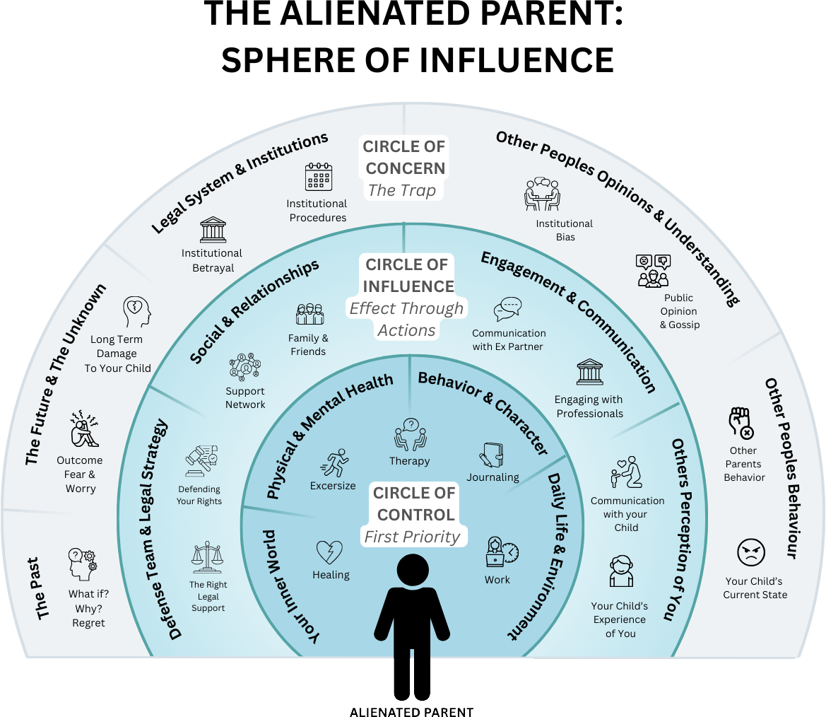 A three-circle framework adapted from Stephen Covey's work for the specific context of parental alienation. The inner Circle of Control covers your behaviour, health, and record-keeping. The middle Circle of Influence covers your child's long-term perception and professional credibility. The outer Circle of Concern covers the alienator's behaviour, court timelines, and your child's current hostility. The goal is to invest 80% of energy in Control, 20% in Influence, and consciously release Concern.