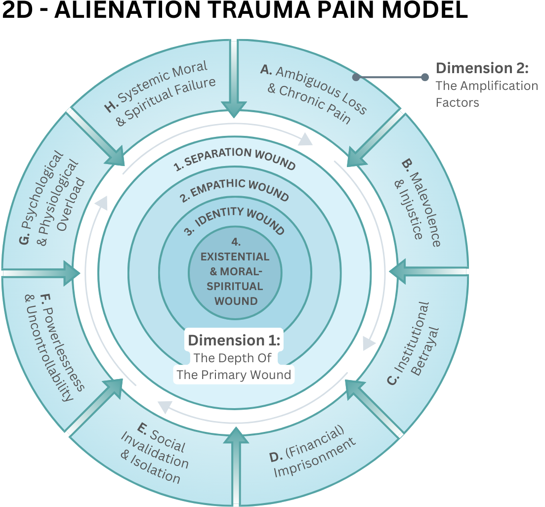 Crucially, these two dimensions do not operate independently. The compounding factors in Dimension Two act as amplifiers of the core wounds in Dimension One. When financial ruin, institutional betrayal, and social isolation all hit at the same time as the deepest layers of grief, the pain is not simply additive — it is exponential.